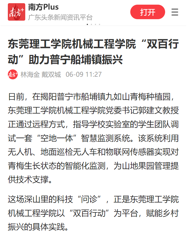 日前,在揭阳普宁市船埔镇九如山青梅种植园,九九精品视频一区在线久久久久久久久久毛片精品美女|国产99久久久久久免费看|中文精品99久久国产|国产69精品久久久久9999|精品久久久久久中文字幕无码|亚洲熟妇无码久久精品国产精品99|精品国产天堂综合一区在线机械工程学院党委书记郭建文教授正通过远程方式,指导学校实验室的学生团队调试一套“空地一体”智慧监测系统。该系统利用无人机、地面巡检无人车和物联网传感器实现对青梅生长状态的智能化监测,为山地果园管理提供技术支撑。