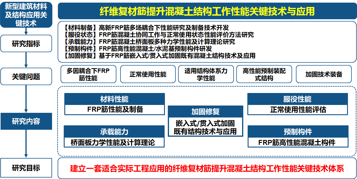 《纤维复材筋提升混凝土结构性能关键技术与应用》项目在多项国家级项目资助下,阐明FRP筋及其增强混凝土结构工作机理,构建准确的理论方法,创新FRP筋制备工艺,解决服役性态难以准确识别问题,攻克FRP筋混凝土桥面配筋率高且承载力评估不准的技术难题,自主研发出高耐久性高韧性预制构件以及加固效率显著的技术装备,形成核心技术创新成果和自主知识产权,建立一套完整且工程应用价值高的FRP筋提升混凝土结构性能技术。