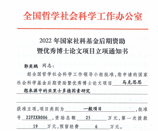 根据全国哲学社会科学工作办公室公布的2022年度国家社会科学基金后期资助暨优秀博士论文出版项目立项名单,马克思主义学院郭奕鹏特聘教授申报的《马克思思想来源中的亚里士多德因素研究》获得立项,实现我校在该学科国社项目零的突破。该研究课题以马克思与亚里士多德的关系为视角,在全面系统消化马克思主要著作、亚里士多德著作及相关研究性论著的基础上,构建马克思与亚里士多德及其传统的思想对话。研究有助于从更开阔的视野理解马克思的思想史地位,从思想源头进一步阐明马克思主义为什么行。