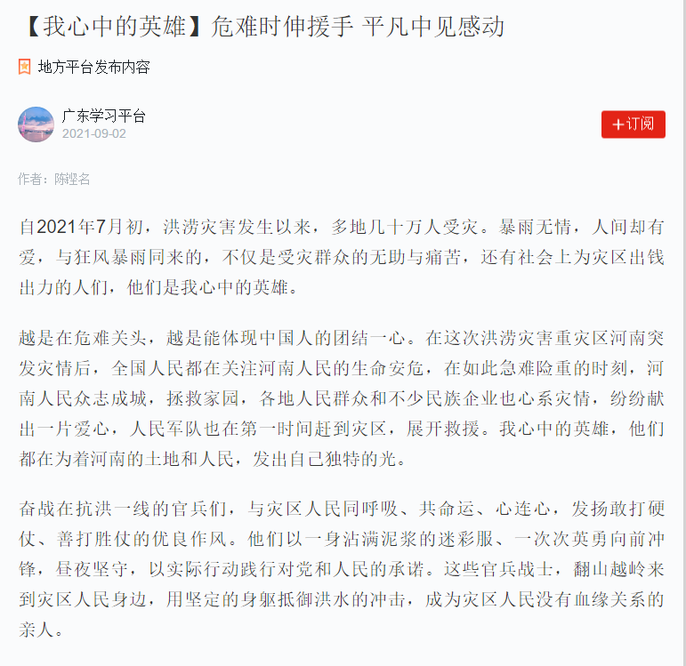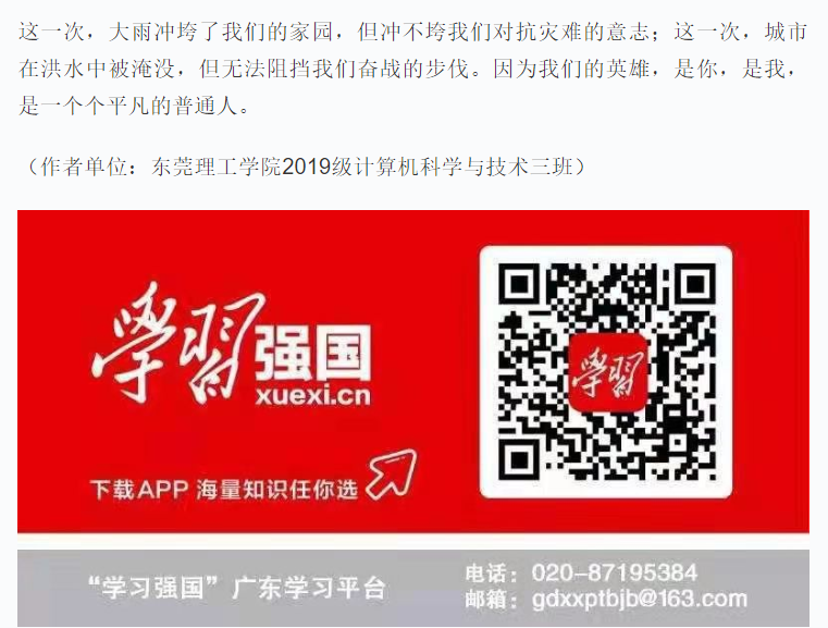 近期,在“学习强国”广东学习平台“我心中的英雄”主题征文活动中,计算机科学与技术学院2019级计算机科学与技术专业陈铿名同学的作品在学习强国平台刊登。文章讲述洪涝灾害中的英雄故事,充分体现出青年大学生学习英雄、崇尚英雄、不负时代、不负韶华的精神风貌。