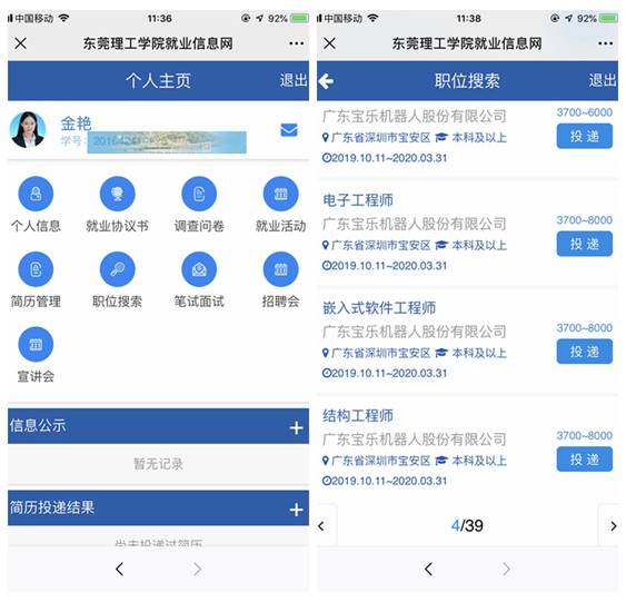 来自电智学院的陈同学表示,开学伊始,就在关注社会各类网站APP发布的招聘信息,感觉没有特别合适的岗位,或者面试地点太远就放弃了。国庆后,关注到学校新的就业系统上线,特别是移动端上查看、搜索专业岗位信息、报名、投递简历都非常便捷,让我们多了一个选择机会,少了一份就业烦恼。