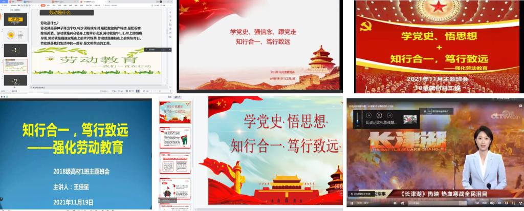 为扎实推进学院“三全育人”综合改革,落实大学生的党史学习教育与劳动教育,11月份以来,材料学院陆续在各年级开展了党史学习和以“知行合一,笃行致远——强化劳动教育”为主题的班会实践活动,得到各班级的积极响应。